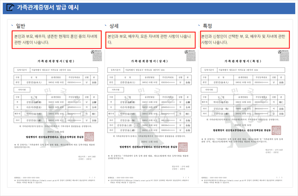 가족관계증명서란 우리 가족의 관계를 나타내는 증명 서류로 부모님, 배우자, 자녀 이렇게 3대의 인적사항이 기재되어있습니다.