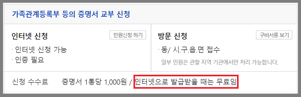 인터넷발급의 장점은 따로 시간을 들여서 직접 방문 할 필요가 없다는 점과 주민센터나 무인발급기에서 발급 시 발생하는 신청 수수료(1,000원)가 무료라는 점입니다.