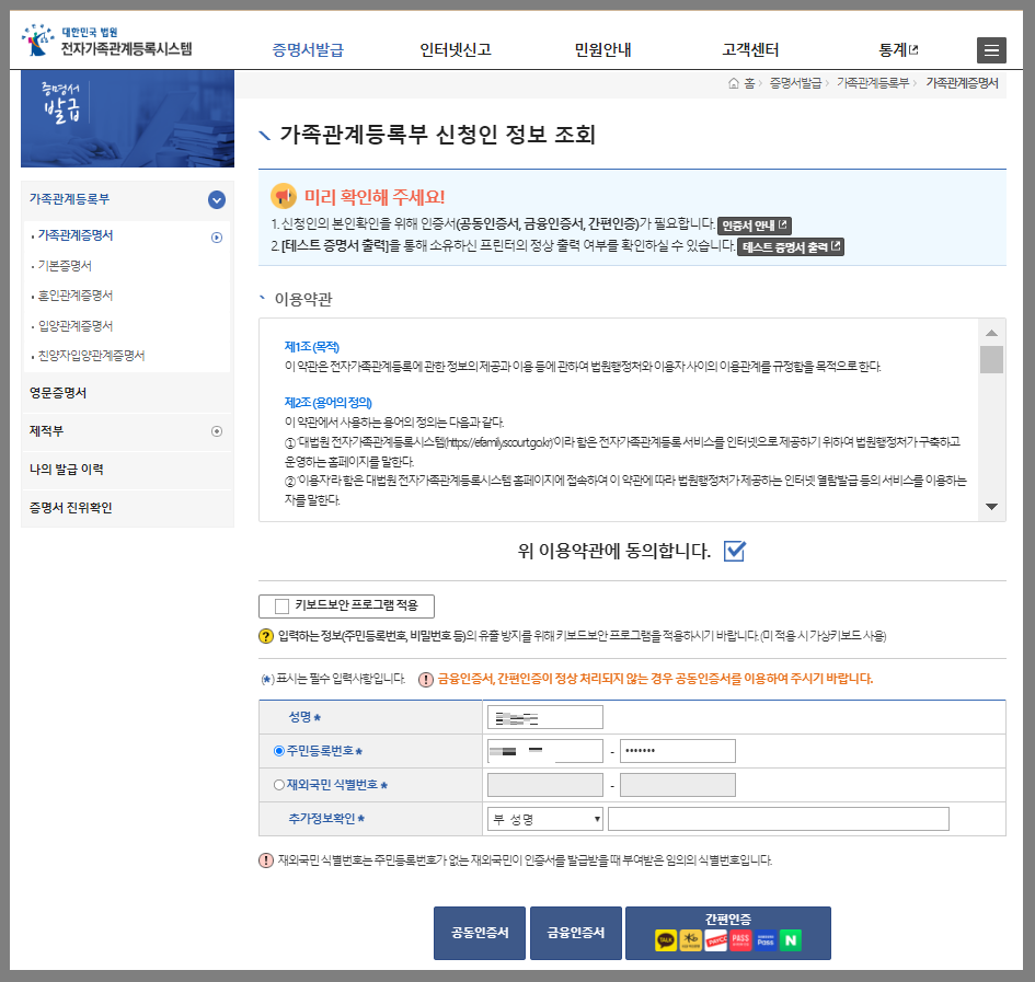 증명서발급 | 가족관계등록부 | 가족관계증명서 | 가족관계등록부 신청인 정보 조회