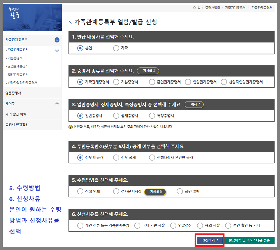 5. 발급 대상자, 증명서 종류, 공개여부, 수령방법, 신청사유 선택 ▶ 신청하기 클릭