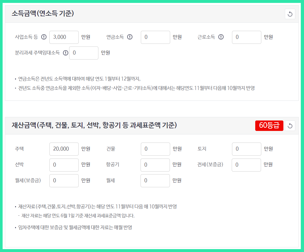 (예시로 사업소득 3천만원, 주택 2억원으로 입력해봤습니다.)