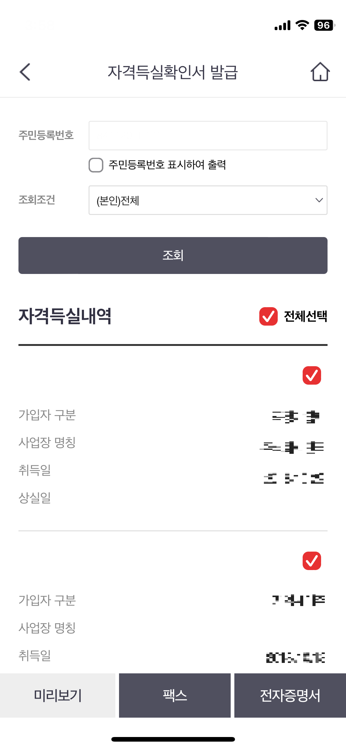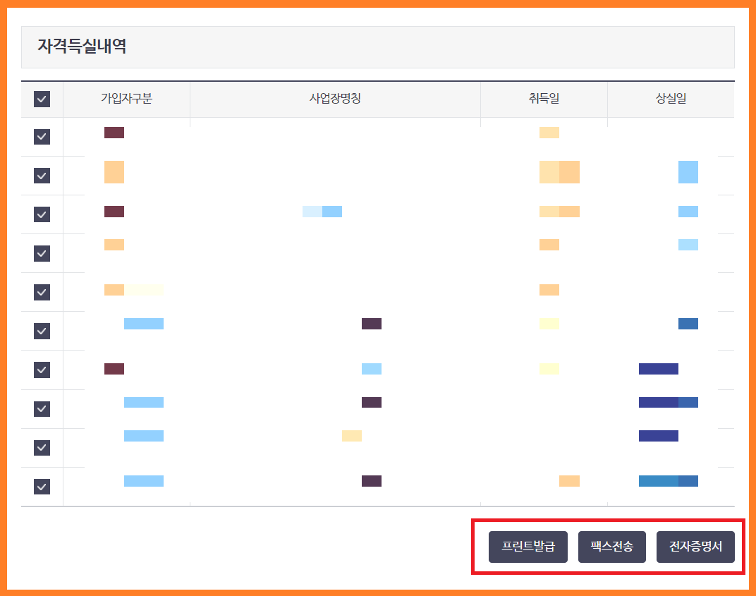 6. 자격득실내역 중 전체 또는 부분 체크 후 원하시는 발급유형을 선택하시면 완료됩니다.