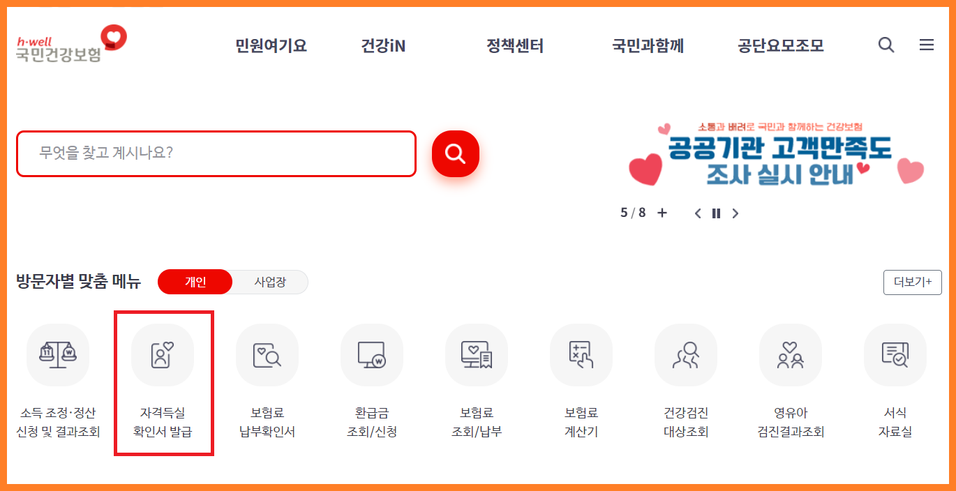 1. 국민건강보험 홈페이지 메인화면▶ 자격득실확인서 발급 클릭