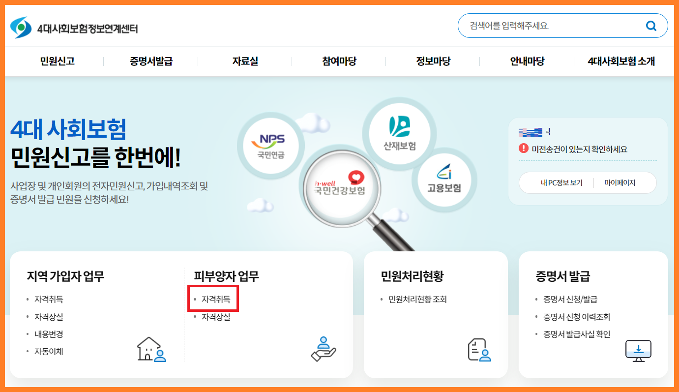 3. 로그인 후 메인화면▶ 피부양자 업무▶ 자격취득