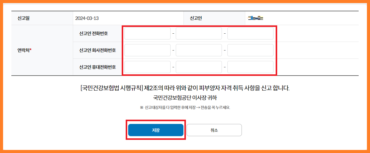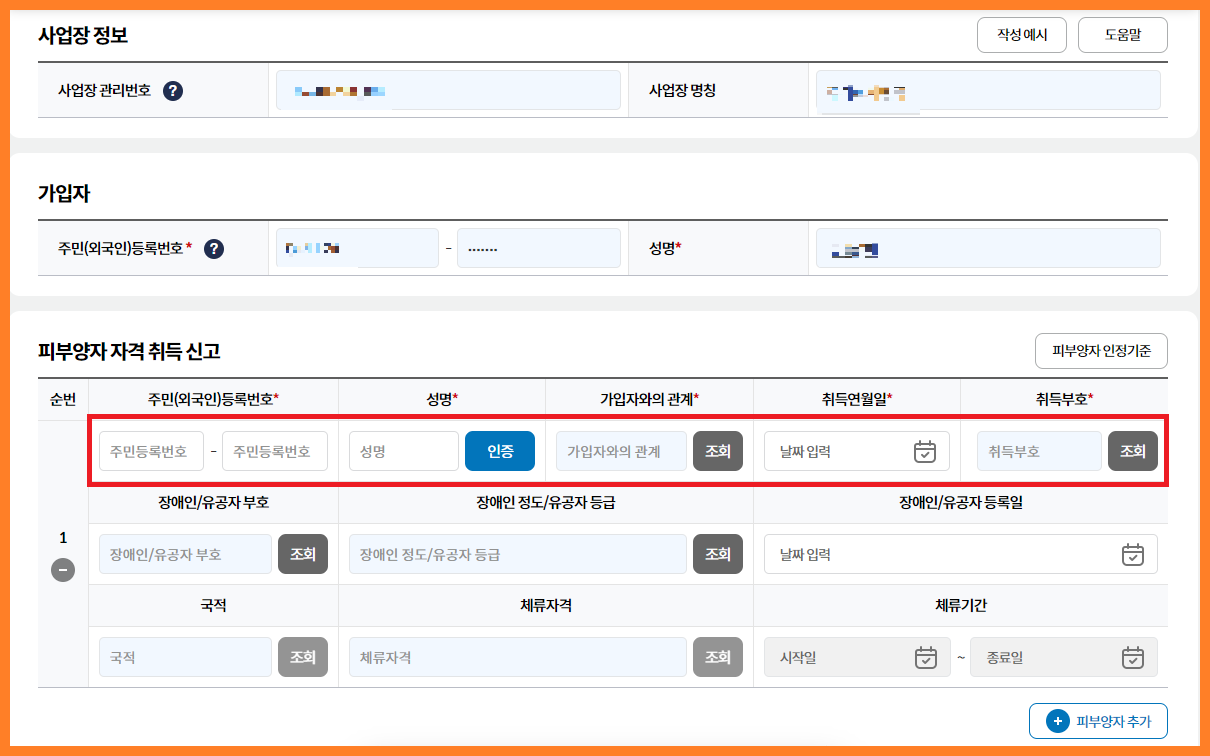 6. 피부양자 자격 취득 신고란에 피부양자 정보 입력 (취득연월일▶ 피부양자의 자격상실 연월일)