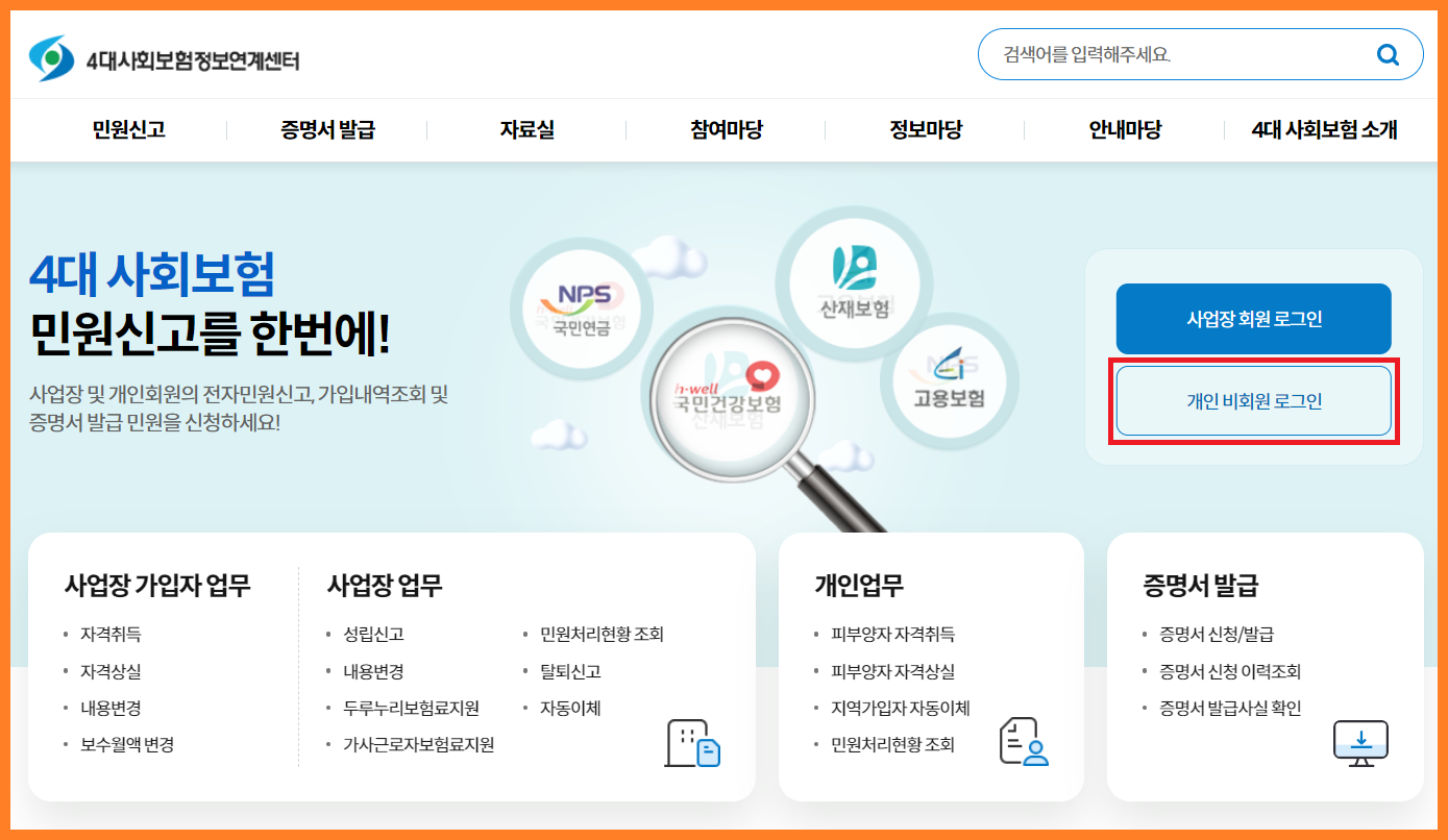 1. 4대사회보험정보연계센터 메인화면▶ 개인 비회원 로그인