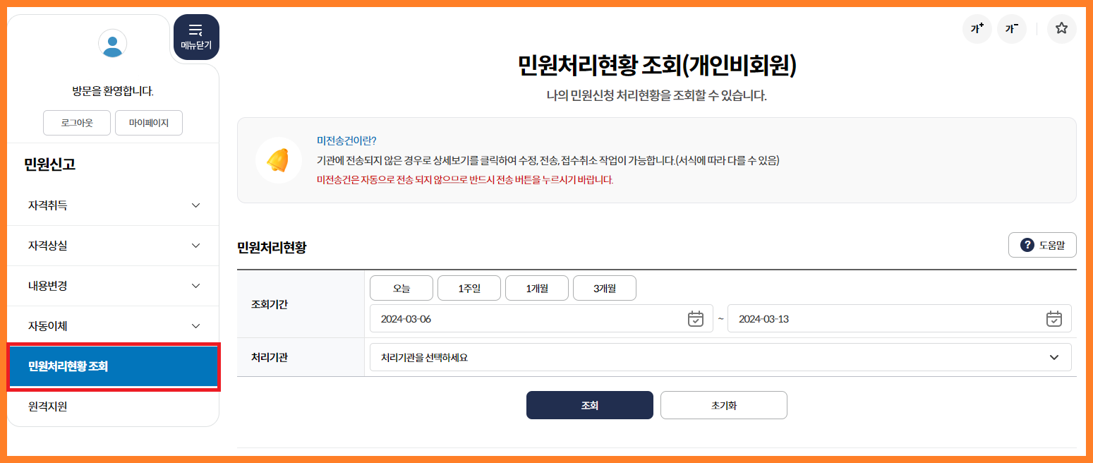Tip 처리상황은 민원처리현황 조회에서 확인하실 수 있습니다.
