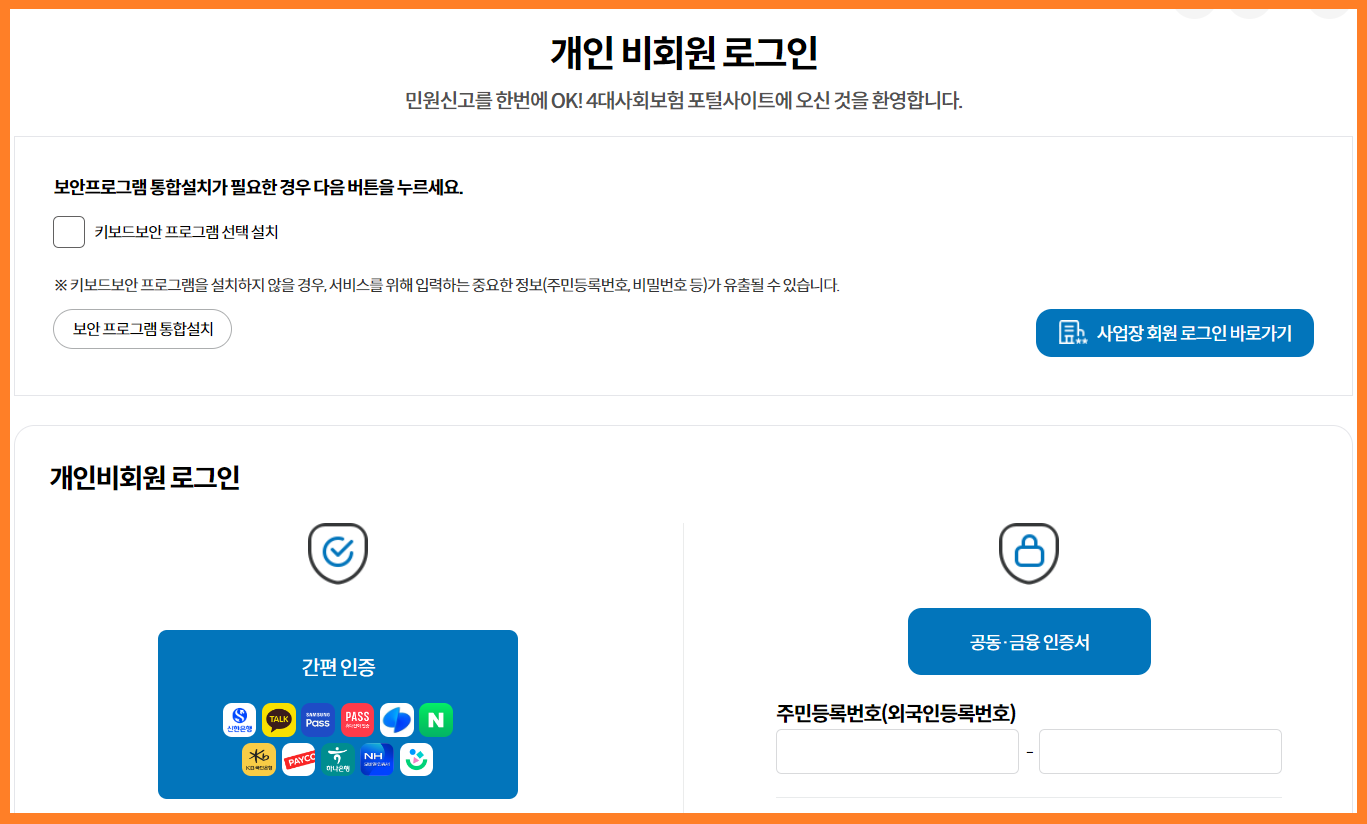 4대 사회보험 민원신고를 한번에! 사업장 및 개인회원의 전자민원신고, 가입내역조회 및 증명서 발급 민원을 신청하세요! 사업장 회원 로그인 개인 비회원 로그인