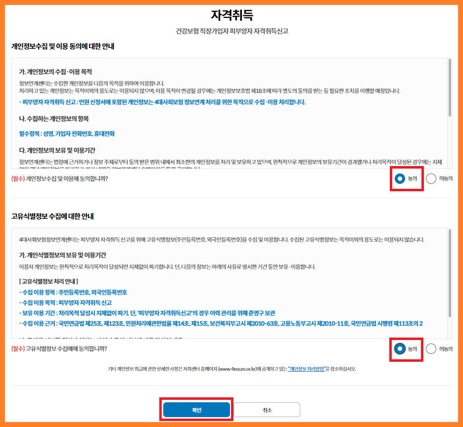 4. 개인정보수집 및 이용 동의▶ 동의 체크▶ 확인