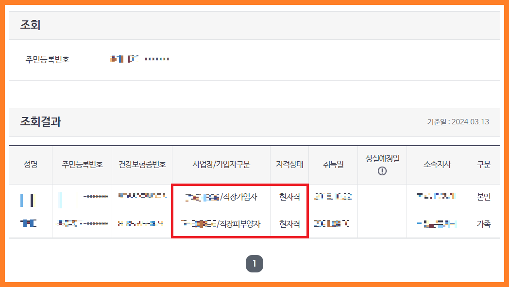 4. 조회결과를 통해 직장가입자와 직장피부양자를 확인하실 수 있습니다.