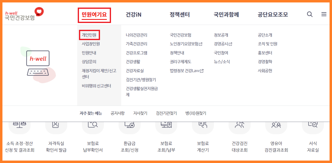 1. 국민건강보험 메인화면▶ 민원여기요▶ 개인민원