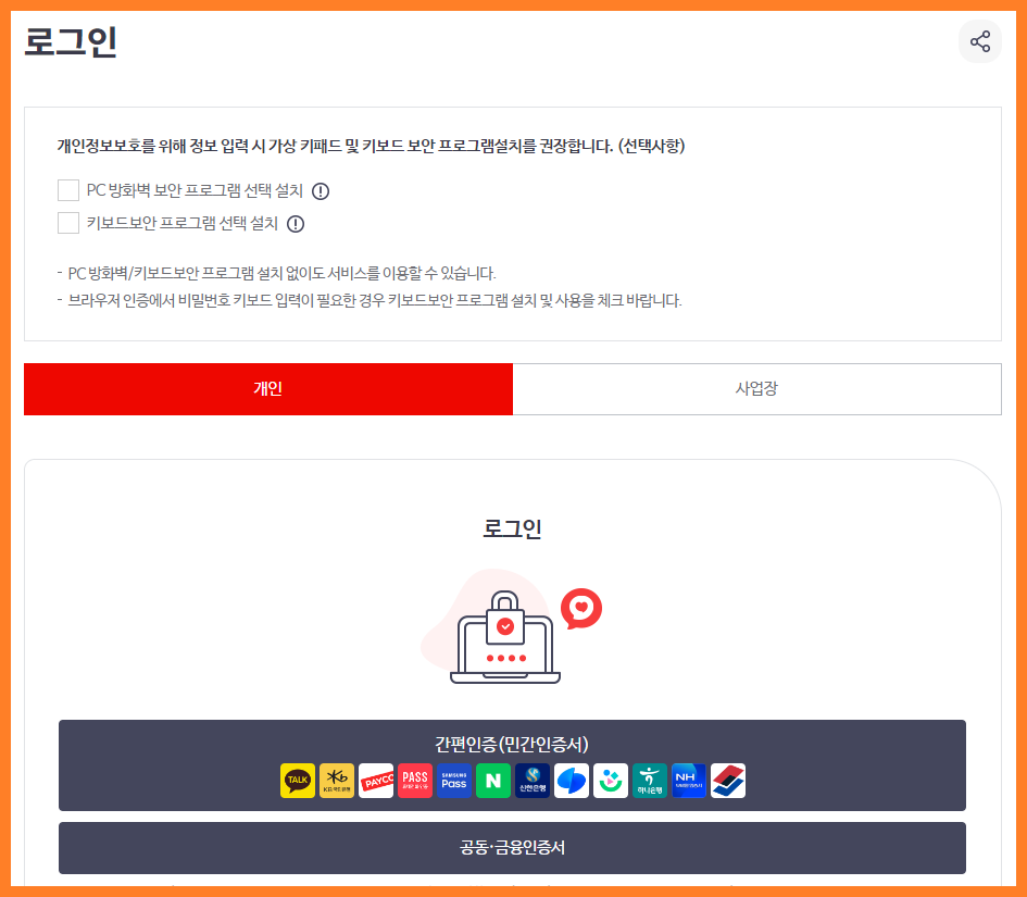 3. 간편인증 또는 공동·금융인증서를 이용하여 로그인