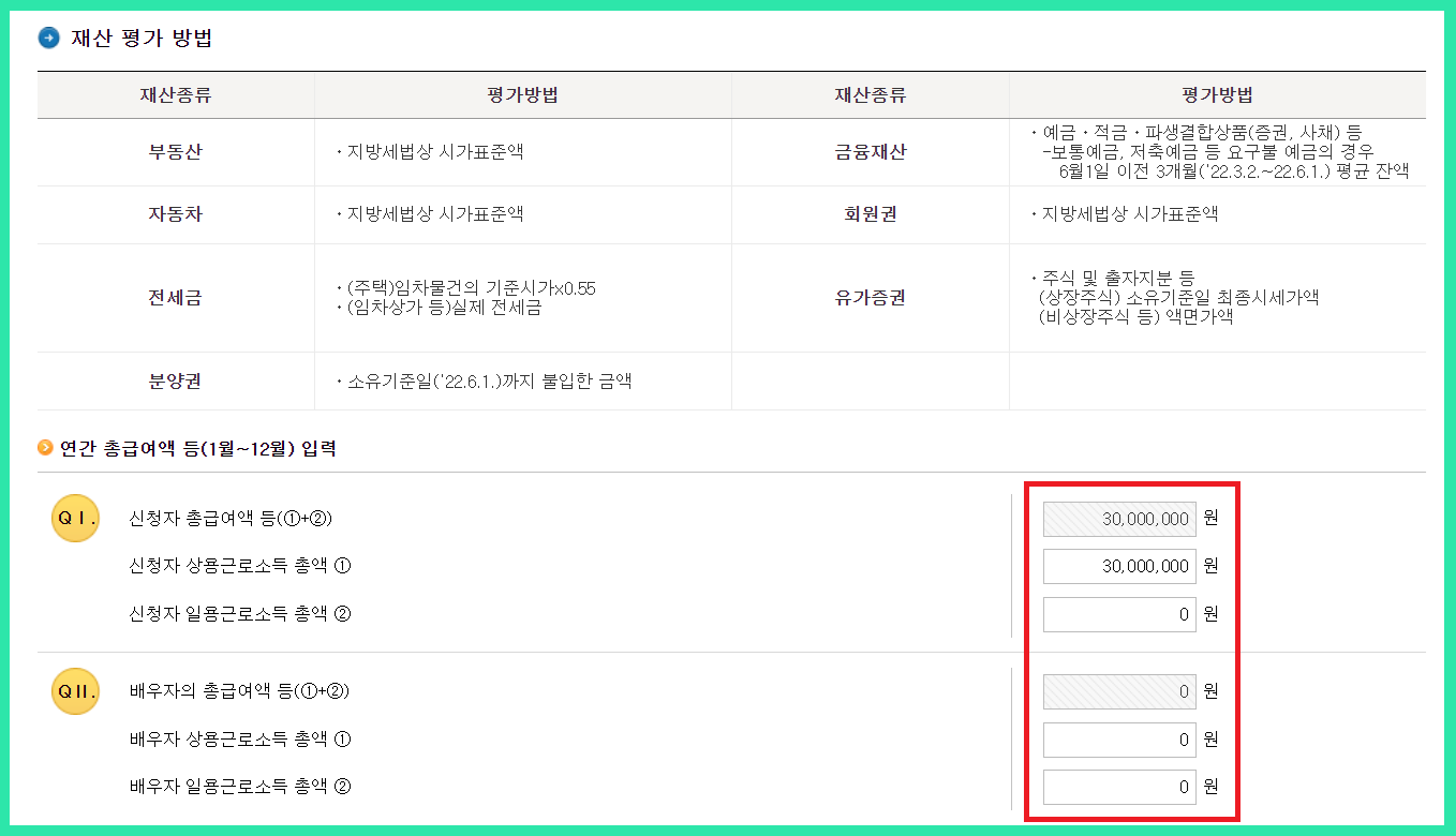 4. 신청자와 배우자 총근로소득 입력 (예시: 신청자 총소득 3천만원, 배우자 소득X)