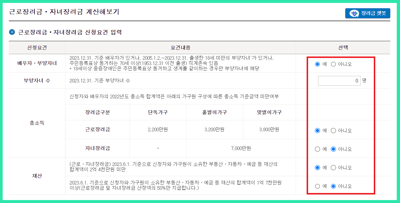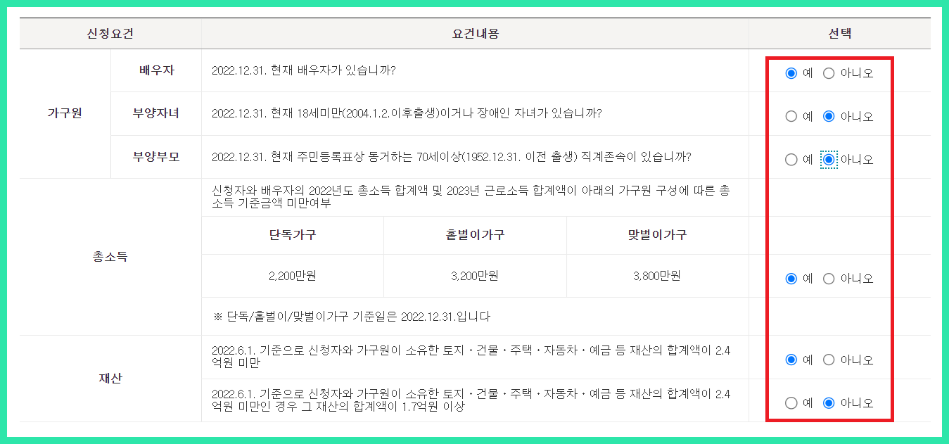 3. 신청요건 선택하기 (예시: 배우자O, 부양자녀·부모X 선택)