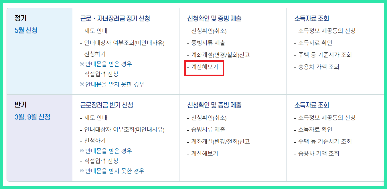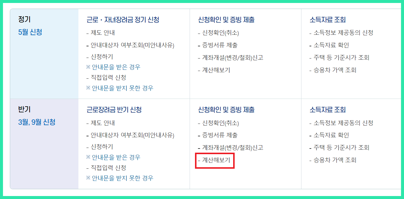 반기별 예상 근로장려금은 상반기분으로 계산되오니, 이번 3월 신청 하반기분은 산정액에서 상반기 지급액을 뺀 금액으로 계산하시면 됩니다.