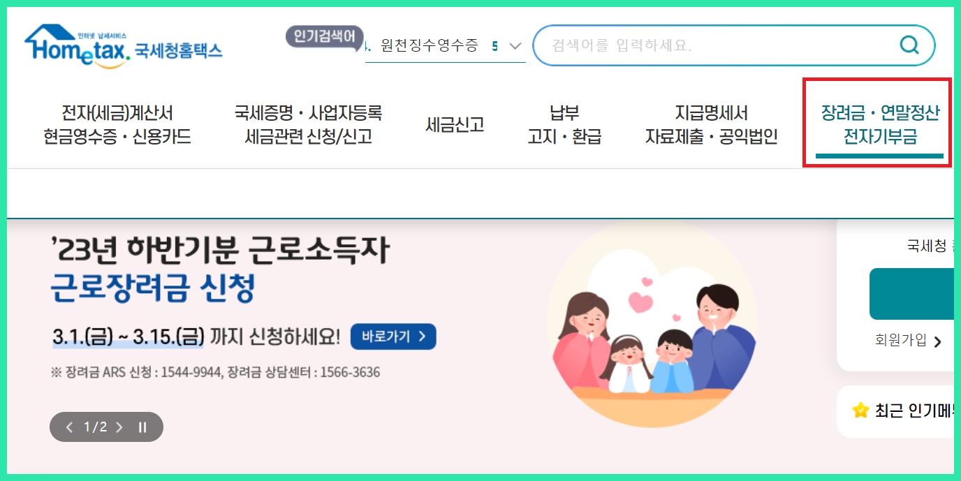 1. 국세청홈택스 홈페이지 접속▶ 장려금·연말정산·전자기부금탭 클릭