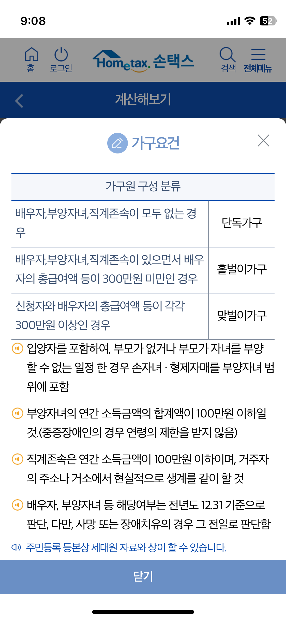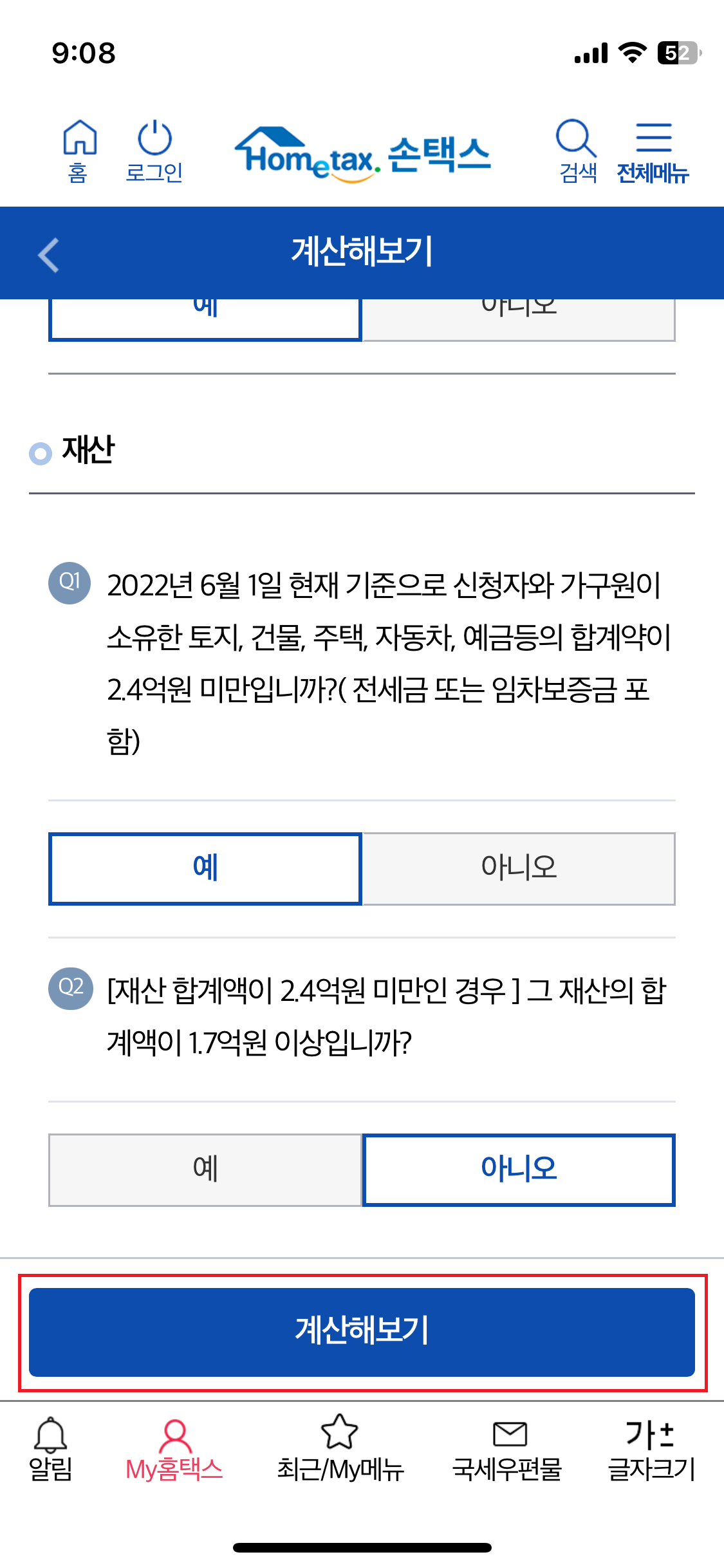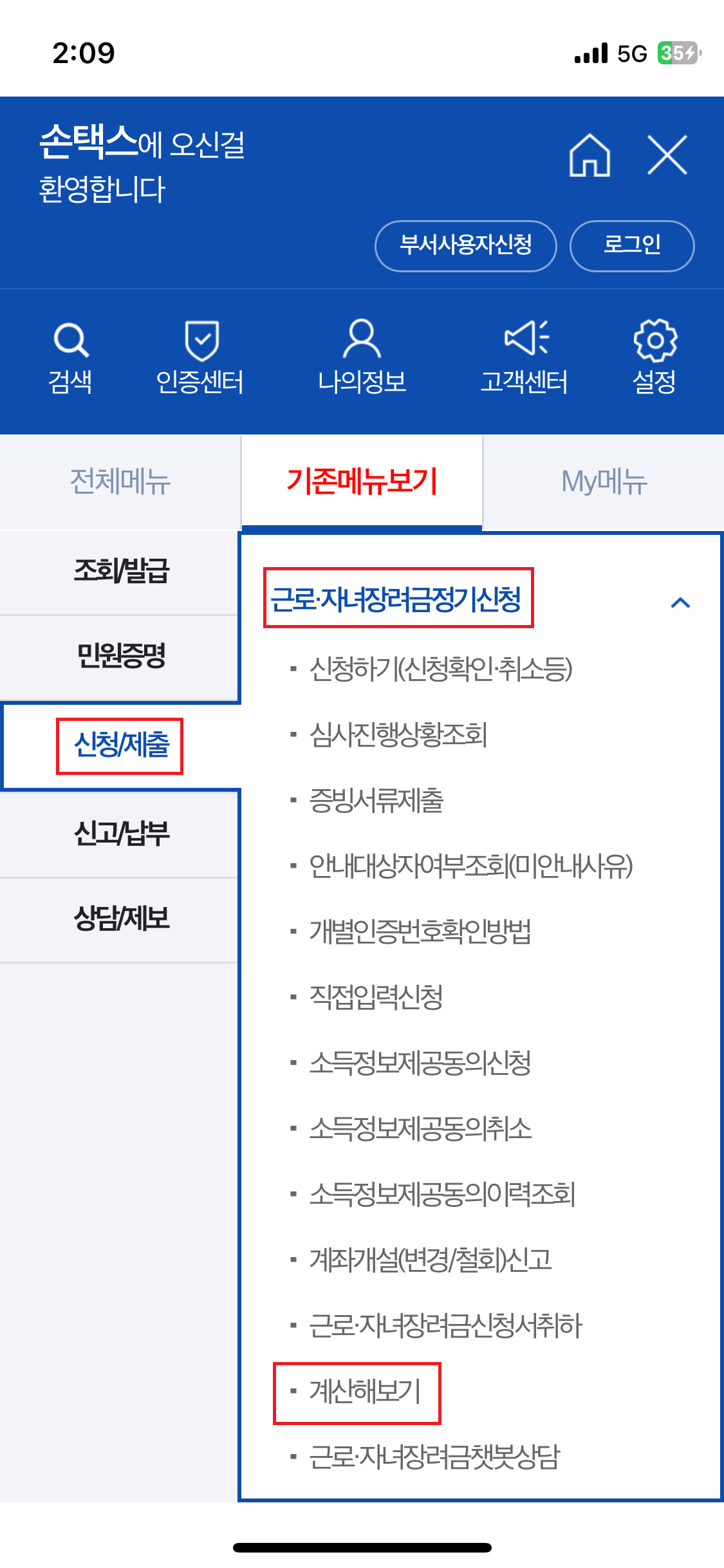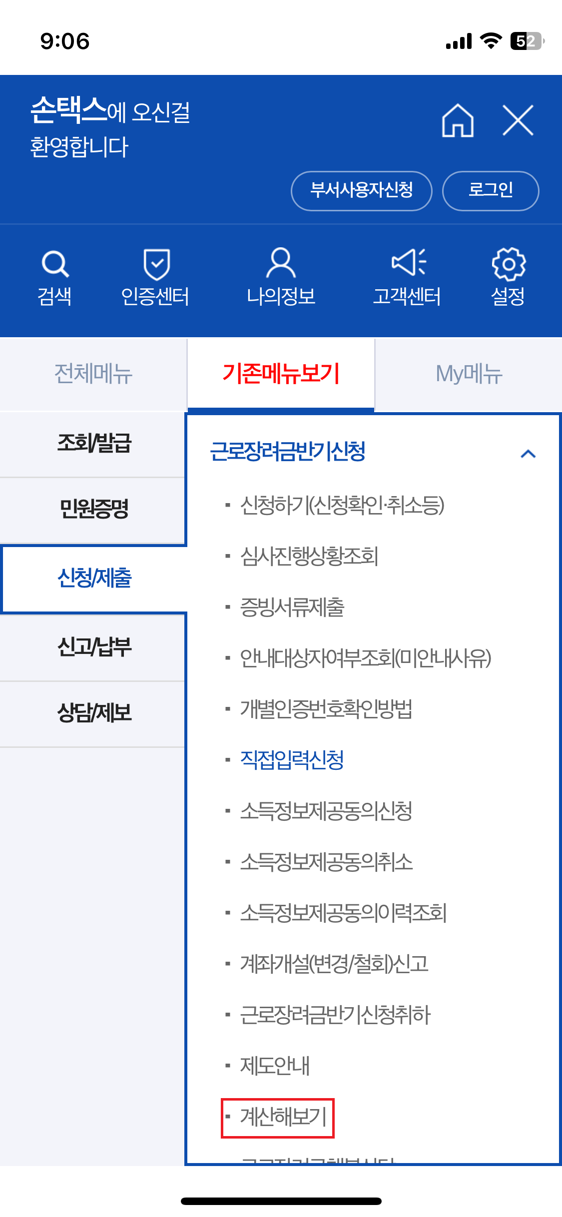 1. 손택스 앱▶ 전체메뉴▶ 기존메뉴보기▶ 근로장려금반기신청▶ 계산해보기