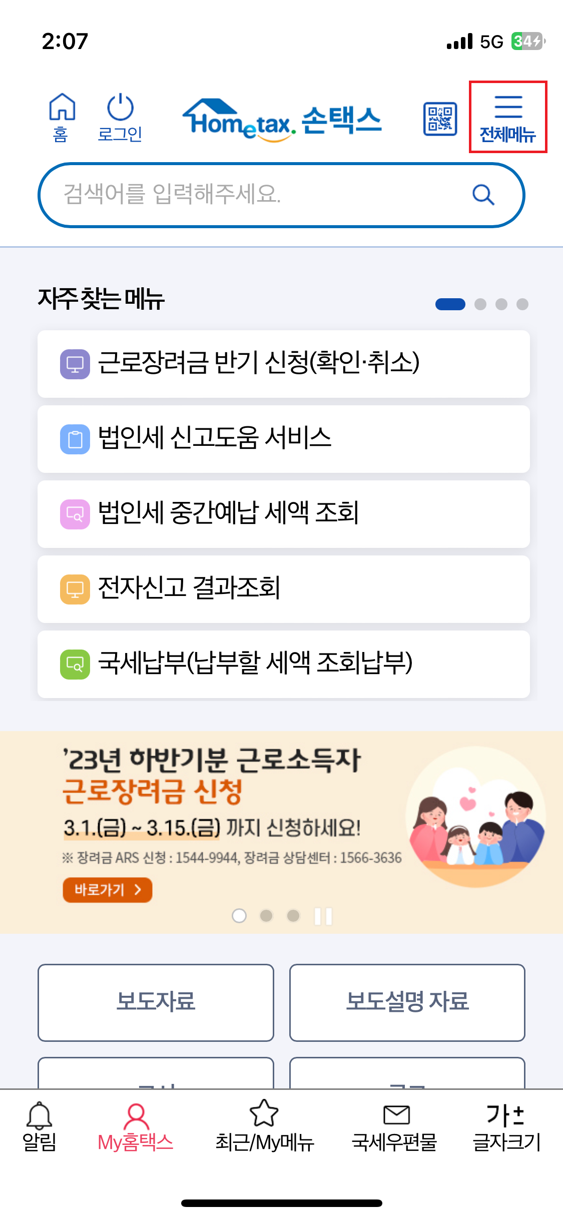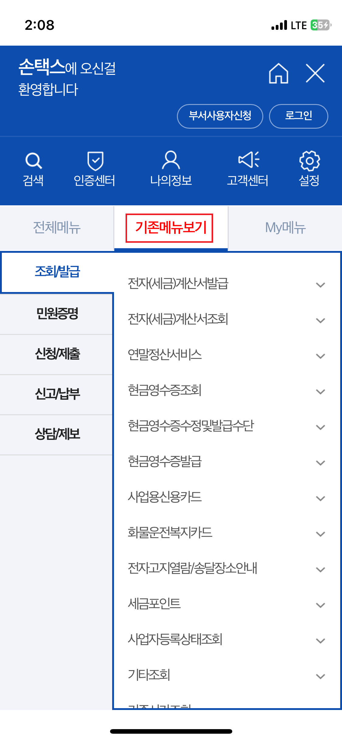 1. 손택스 앱▶ 상단 전체메뉴▶ 기존메뉴보기