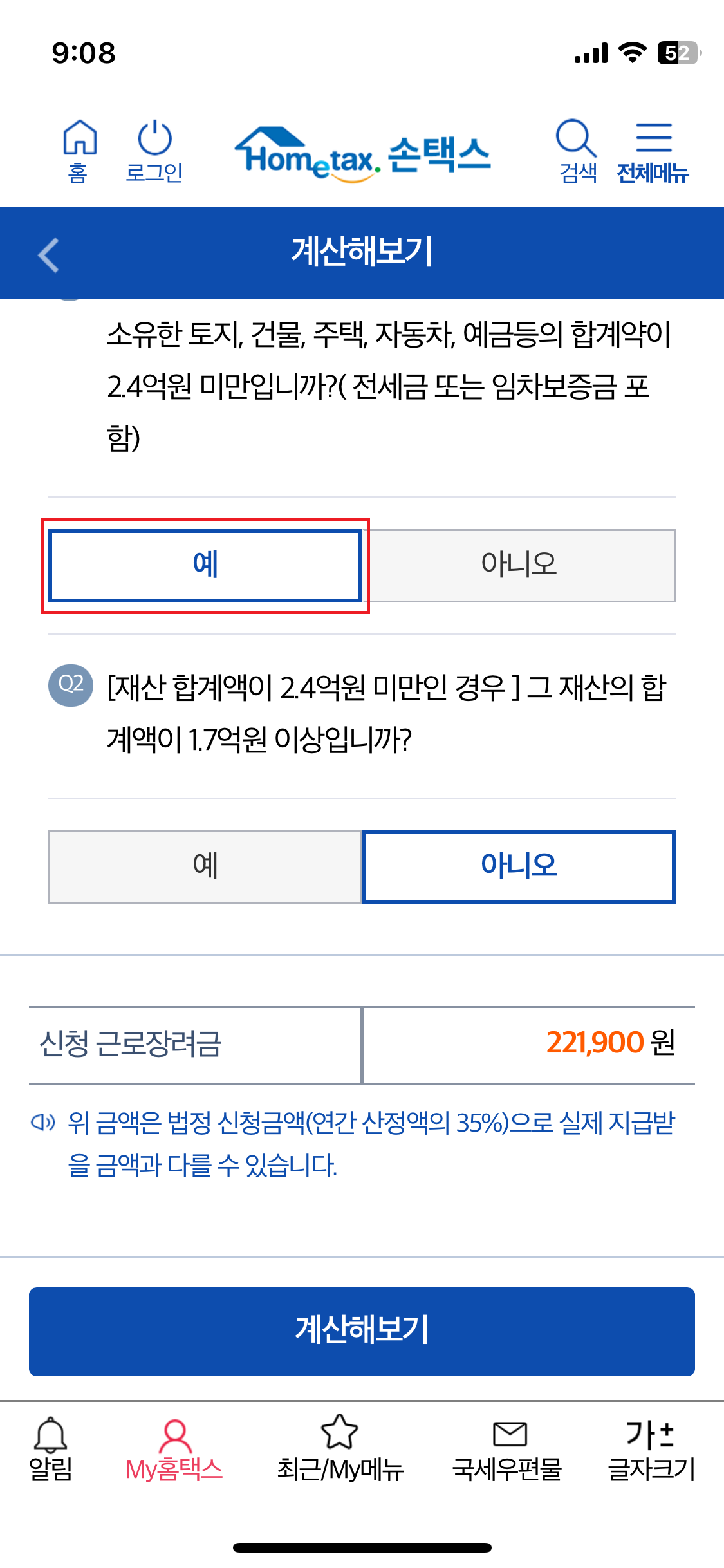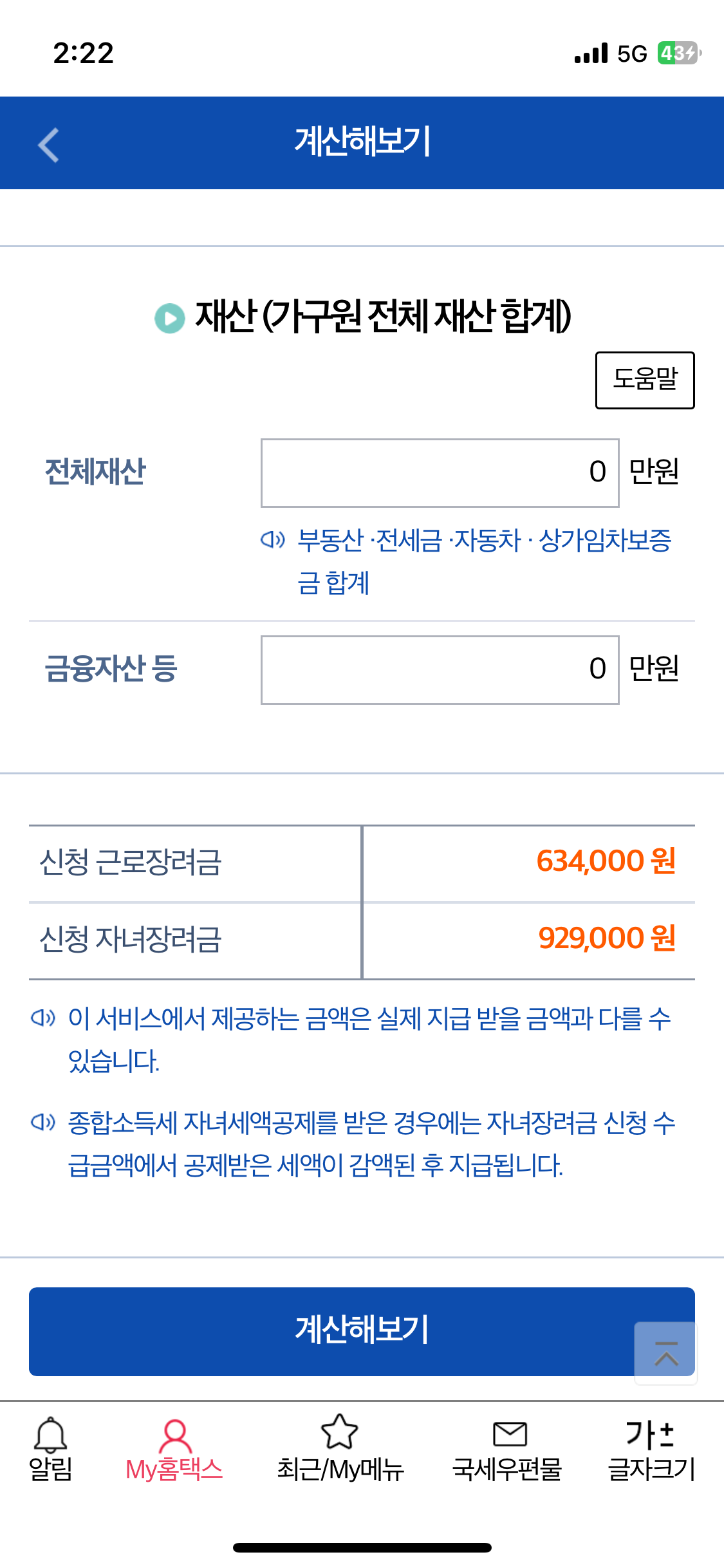 3. 재산 입력▶ 계산해보기▶ 신청 근로장려금,자녀장려금을 확인하실 수 있습니다.