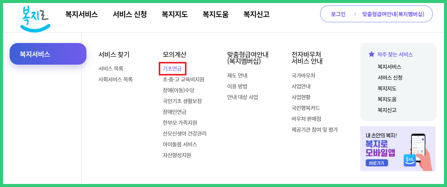 1. 복지로 홈페이지 (https://www.bokjiro.go.kr/)접속 ▶복지서비스 ▶모의계산 ▶기초연금 클릭