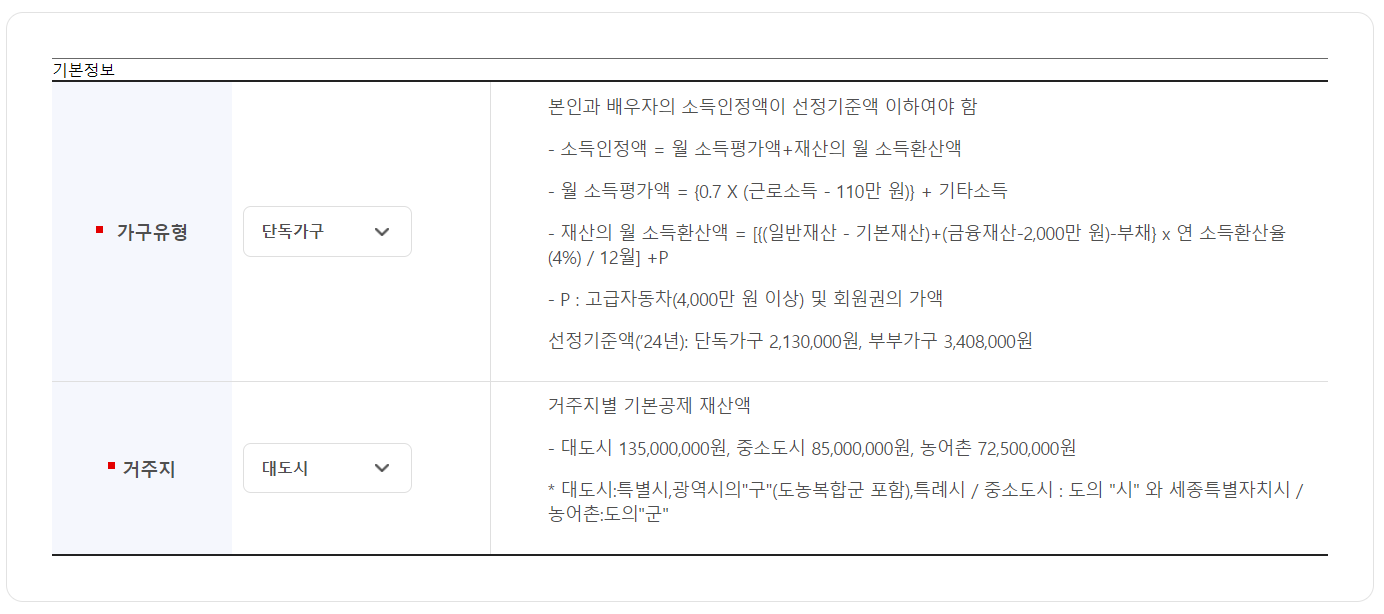 1) 만 65세 이상 2) 대한민국 국민(국적이 대한민국) 3) 대한민국 거주 중 4) 소득액이 일정액 이하(소득 하위 70%)