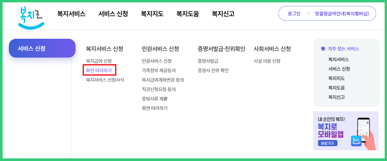 1. 복지로 홈페이지(http://www.bokjiro.go.kr)접속▶ 서비스 신청▶ 화면 따라하기 클릭