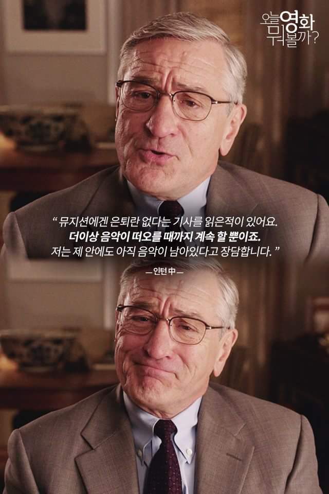 영화 '인턴' 에서 로버트 드니로가 연기한 주인공 '벤'은 70세의 나이에 인턴으로 채용됩니다. 벤은 수십 년 직장생활에서 비롯된 노하우와 풍부한 인생경험을 바탕으로 회사와 동료들에게 없어서는 안 될 멘토가 되어줍니다. 그리고 벤 자신 또한 새로운 일자리를 통해 사회적 교감과 활기찬 삶을 보내게 됩니다.