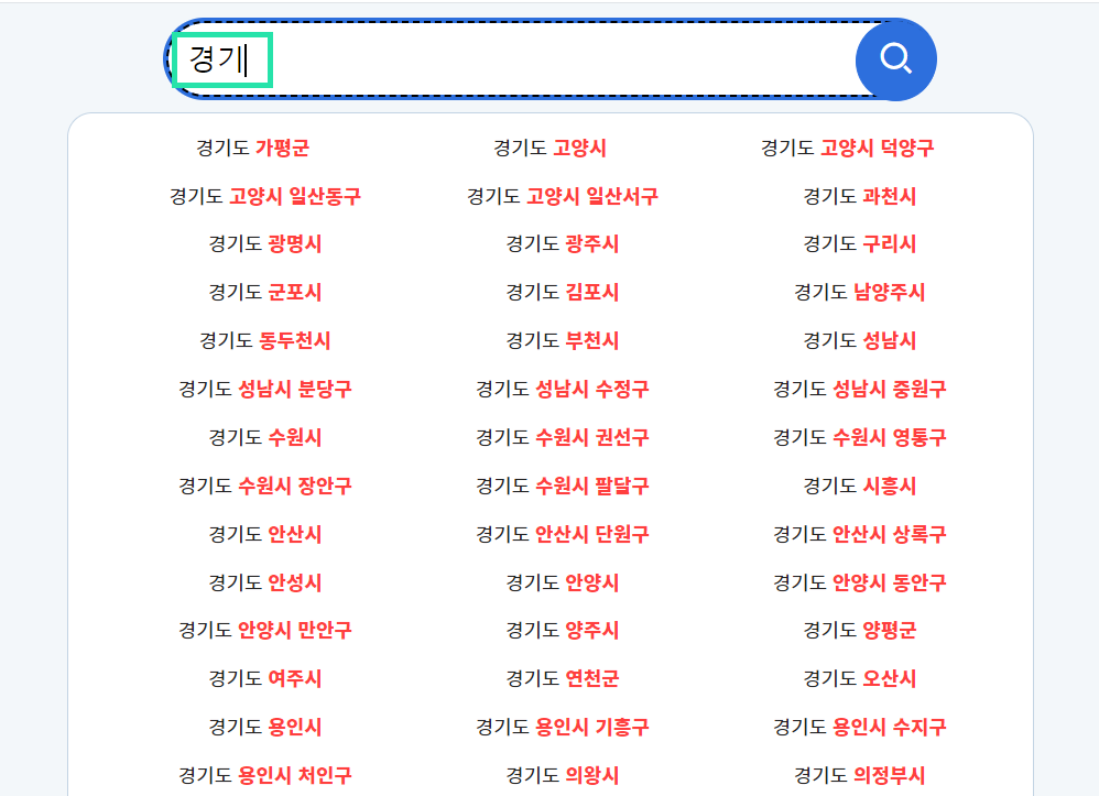 2. 원하시는 일자리 지역을 입력하시고 해당지역을 클릭합니다. (ex: 경기도 수원시를 클릭해봤습니다.)