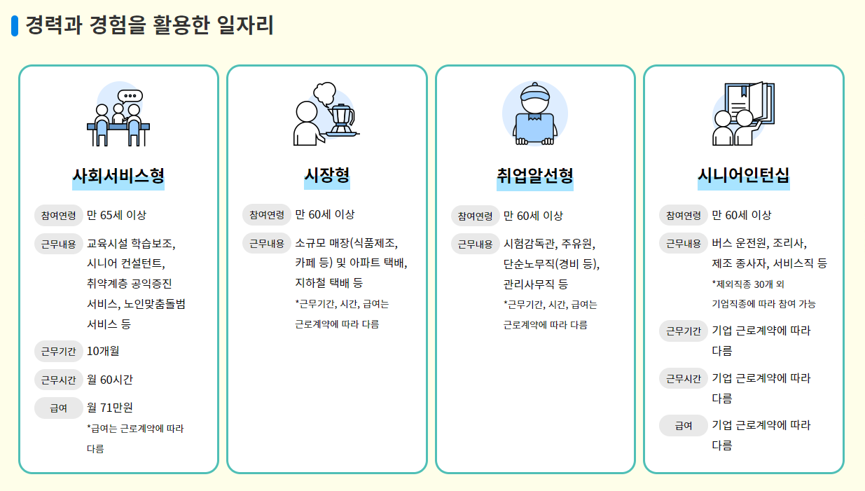 해당 일자리는 사회서비스형, 시장형, 취업알선형, 시니어인턴십으로 분류되어 있으니 전직 경력과 경험에 맞는 유형을 선택하시면 됩니다.