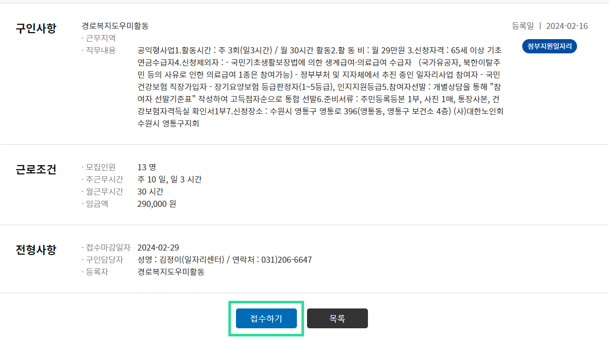 5. 원하시는 일자리에 부합하시면 접수하기를 클릭합니다.