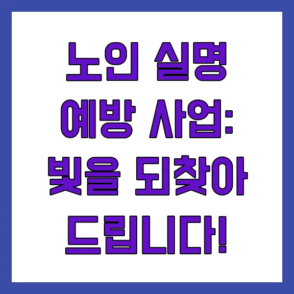 노인 실명 예방 사업은 어르신들의 눈 건강을 지키고 행복한 노년을 지원하기 위한 중요한 사업입니다! 적극적인 참여와 관심으로 어르신들의 밝은 눈을 되찾아 드리고, 건강하고 활기찬 노년 생활을 함께 만들어 갑시다! 😊