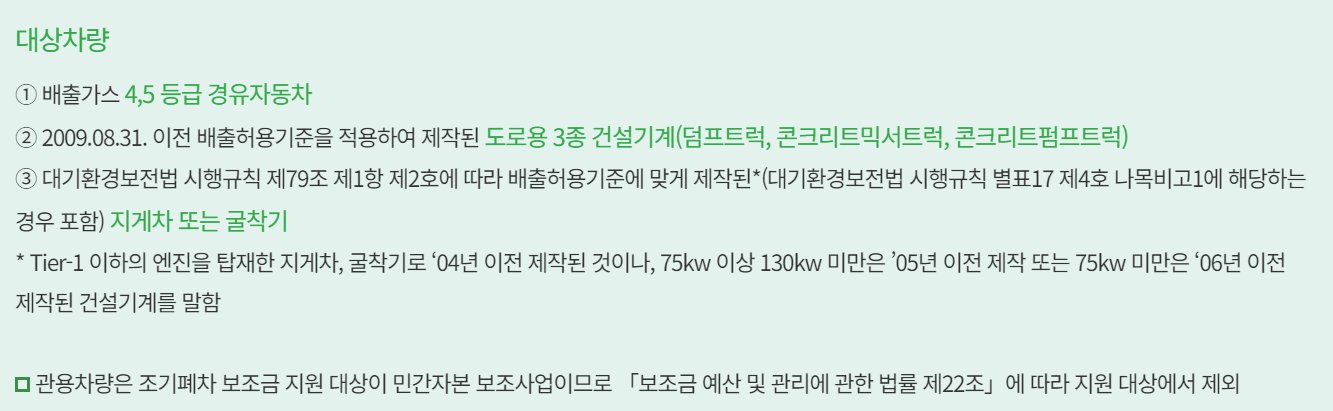 조기폐차 신청조건으로는 총중량 3.5t 미만인 차량·건설기계는 6개월 이상 관내에 등록이 유지돼 있고, 그간 정부나 지자체 지원으로 배출가스 저감장치 등을 부착한 이력이 없으면 보조금을 받을 수 있습니다.