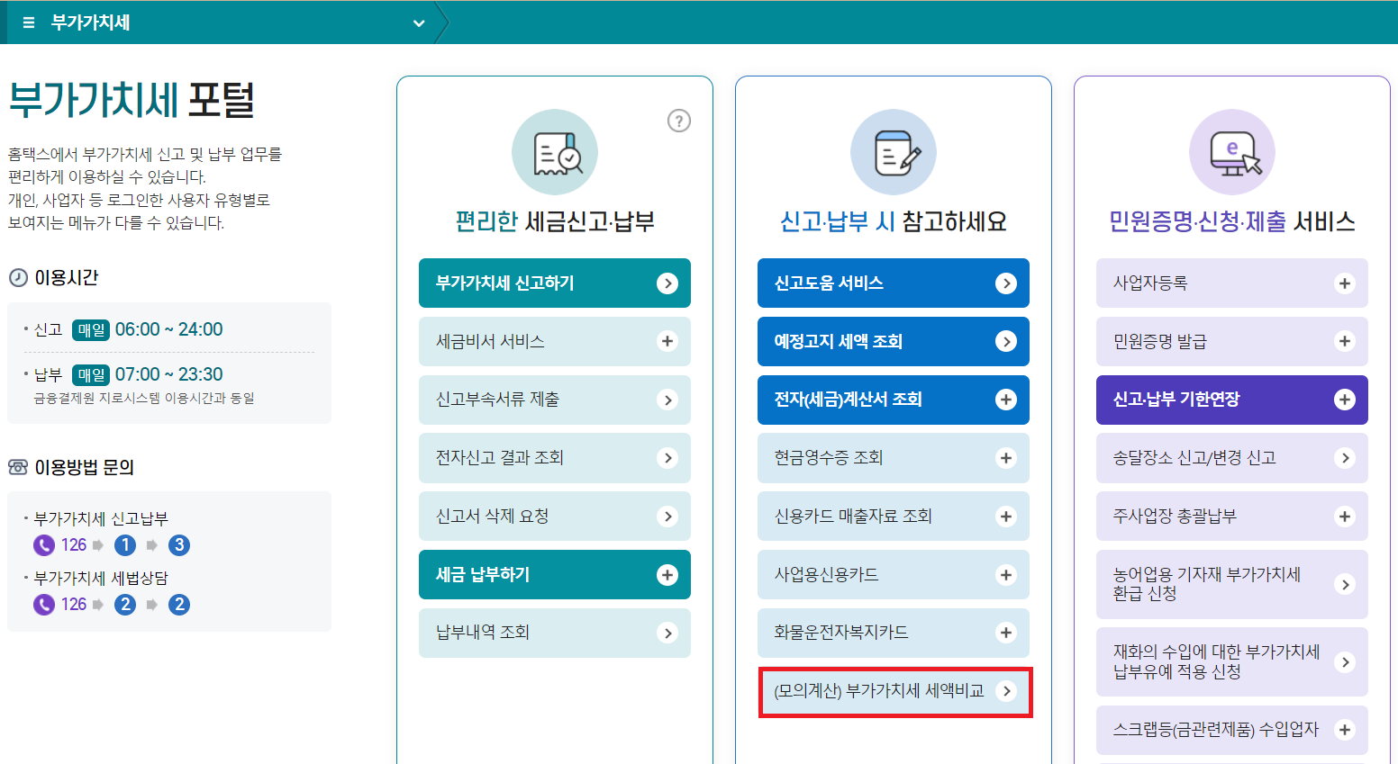 1. 위 링크 또는 아래 해당 경로를 통해 국세청 홈택스 부가세 모의계산(계산기)에 들어갑니다.
