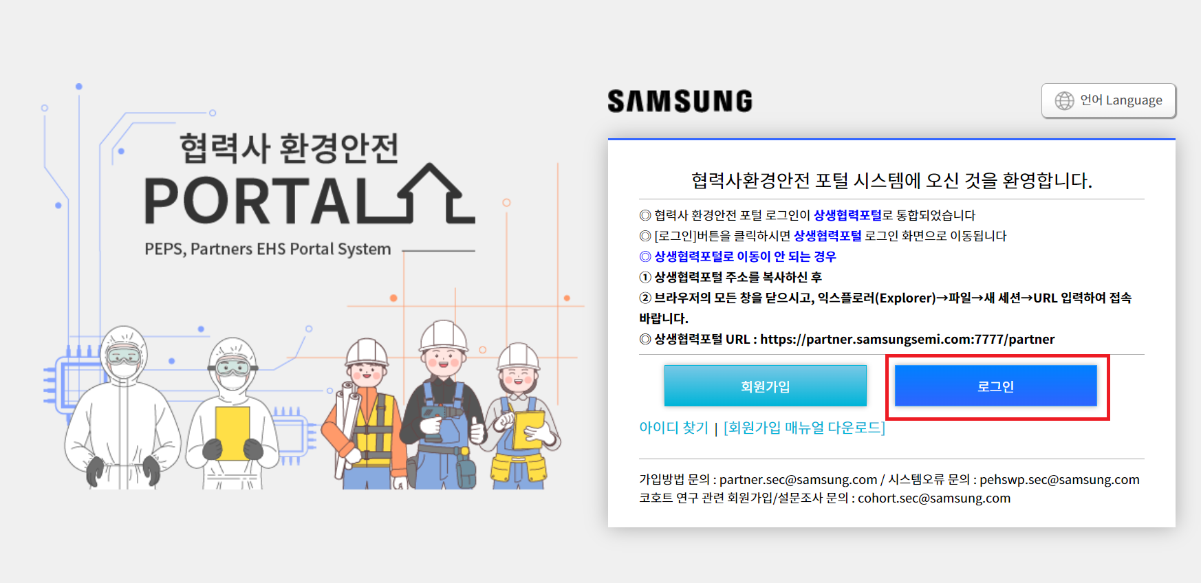 협력사환경안전 포털 시스템에 오신 것을 환영합니다. • 협력사 환경안전 포털 로그인이 상생협력포털 로 통합되었습니다 • [로그인]버튼을 클릭하시면 상생협력포털 로그인 화면으로 이동