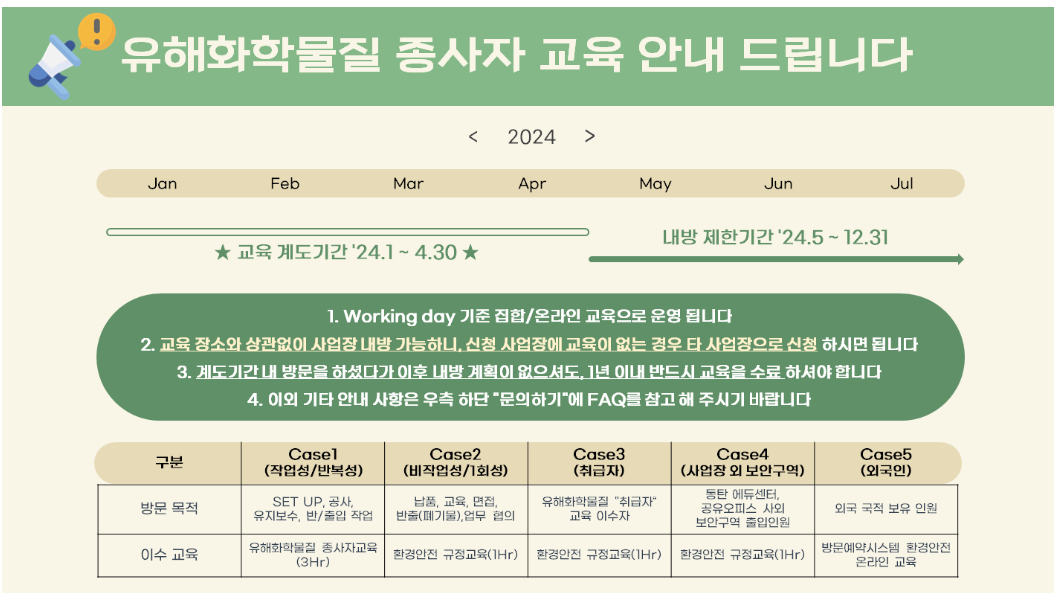 저의 경우 1년에 한 번 유해화학물질 종사자 교육을 받게 되어있는데요. 4월 30일까지 계도기간 안에 교육을 수료하셔야 올해 남은 기간 내방신청이 가능하니 꼭 확인하시고 교육 신청하시길 바랍니다.