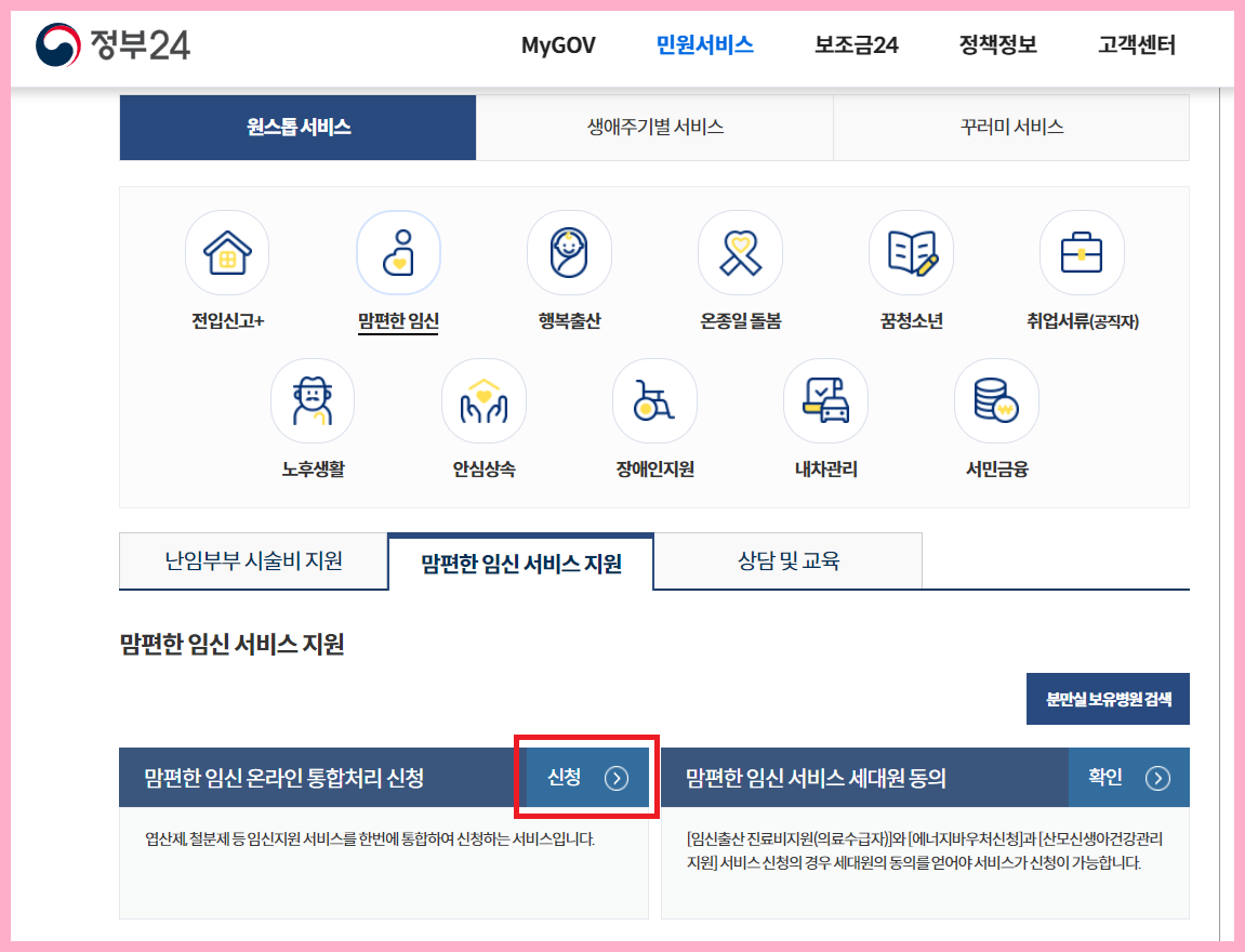 1. 정부24 홈페이지(www.gov.kr) ▶ 맘편한 임신