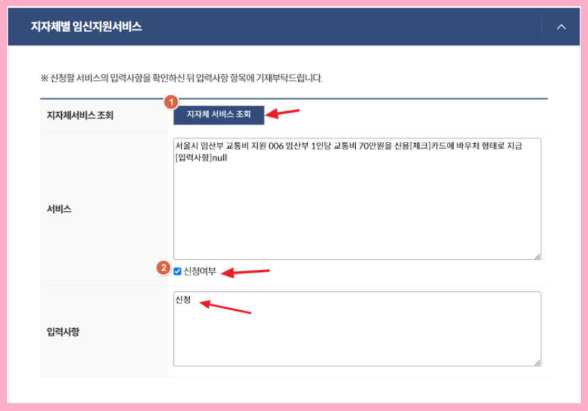4. 서비스 신청 페이지 하단 ▶ 지자체 서비스 조회 클릭 ▶ 신청여부 체크 ▶ 입력사항 입력
