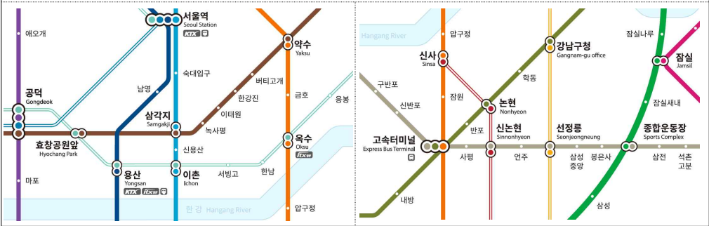 - 역 표시: 역은 노선 색과 구별하기 위해 흰색으로 표시. 외곽 노선에서는 검은색을 사용.