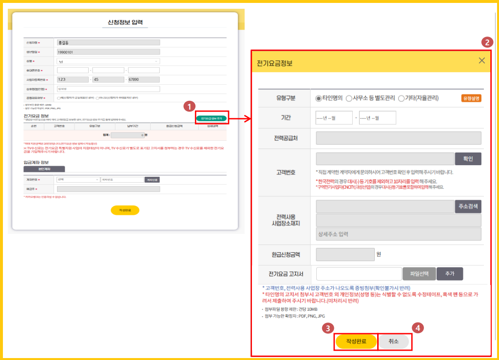 4. 기본 신청정보 입력▶ 전기요금 정보 입력▶ 입금계좌 정보 입력▶ [작성완료] 버튼을 클릭