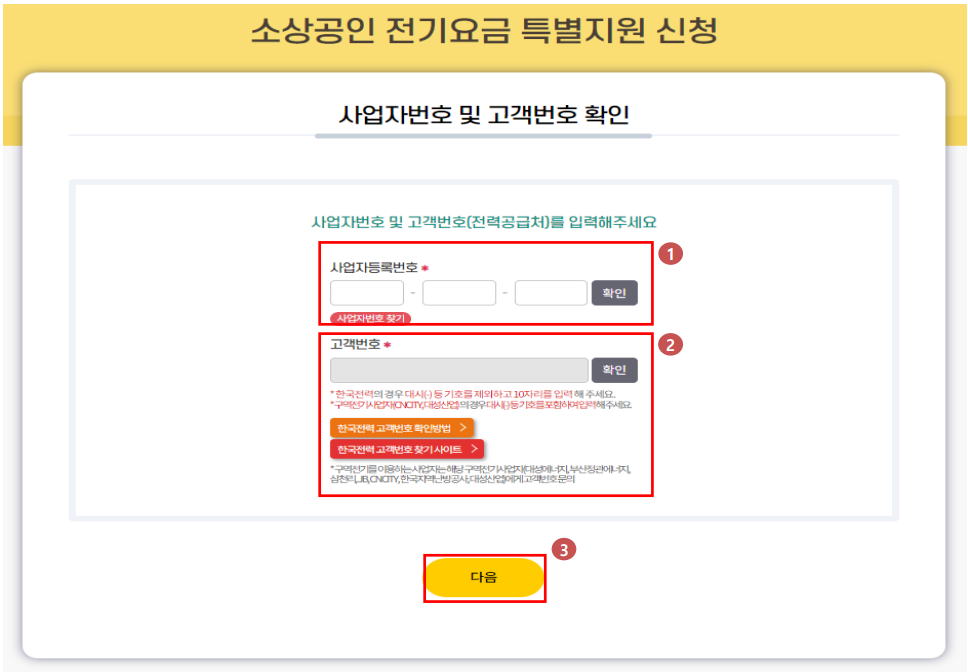 1. 사업자등록번호를 입력하신 후 [확인] 버튼 클릭▶ 고지서에 표기된 고객번호를 입력하신 후 [확인] 버튼 클릭▶ 사업자등록번호와 고객번호 확인을 완료한 후, [다음] 버튼 클릭