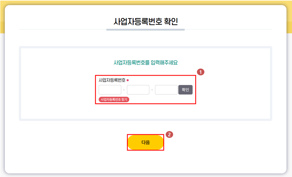 1. 사업자등록번호를 입력하신 후 [확인] 버튼 클릭▶ [다음] 버튼 클릭