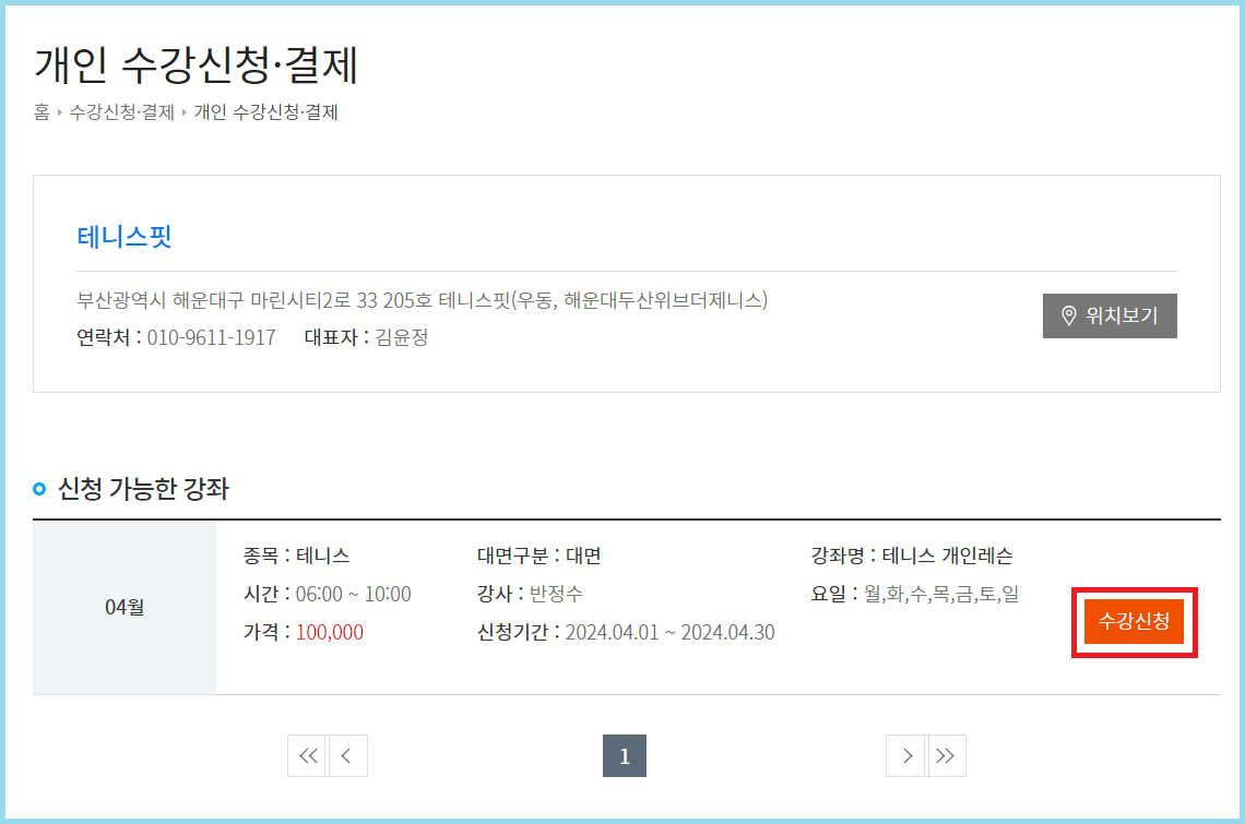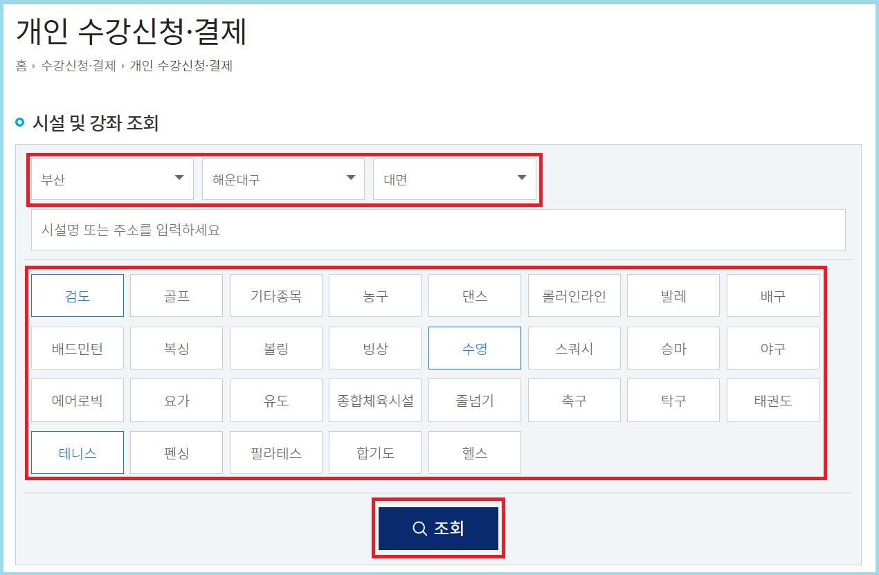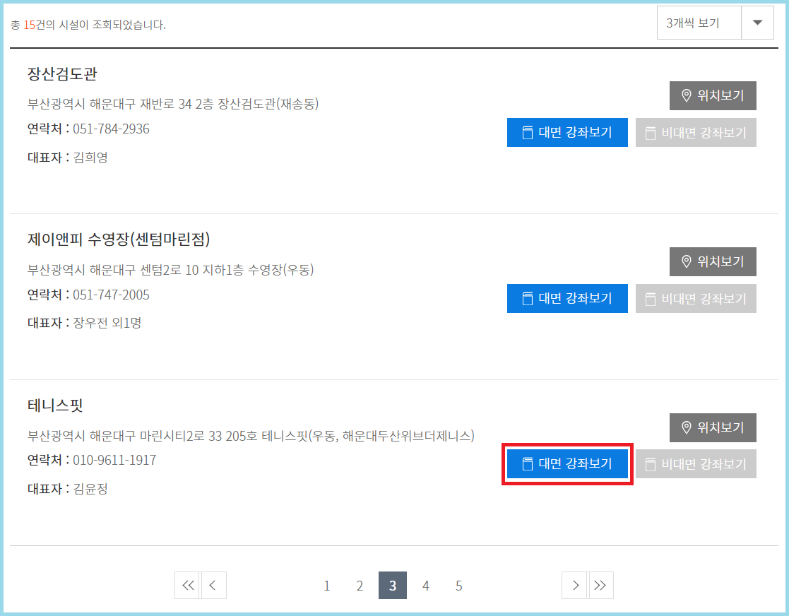 ex) 부산 해운대구 대면수강으로 검도, 수영, 테니스를 선택하여 조회해 보았습니다.