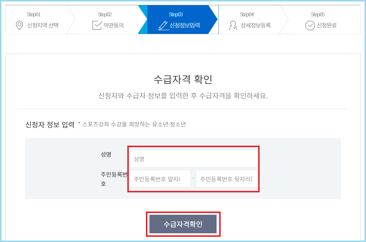 5. 수급자격 확인 ▶ 성명, 주민등록번호 입력 후 수급자격확인 클릭 ▶ 상세정보등록 ▶ 신청완료