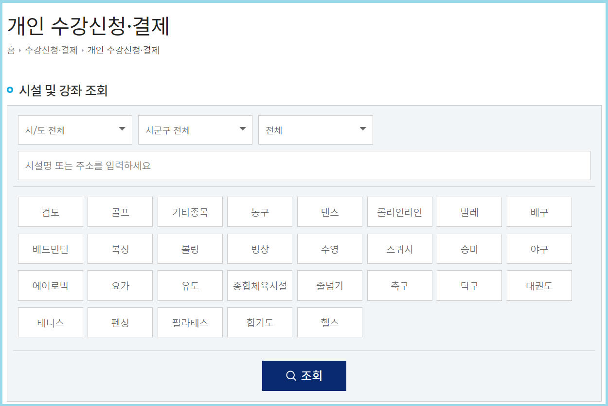 2. 시설 및 강좌 조회 ▶ 시/도 선택 ▶ 시/군/구 선택 ▶ 대면/비대면 선택 ▶ 스포츠 종목 선택