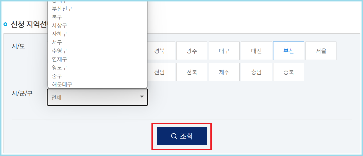 2. 신청 지역선택 (시/도, 시/군/구 선택) ▶ 조회 클릭