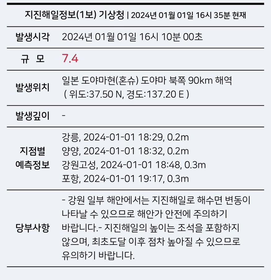 기상청은 1일 오후 일본 이시카와현 노토반도 북쪽 해역 강진으로 발생한 지진해일(쓰나미)이 동해안에서 관측되고 있다고 밝혔습니다.