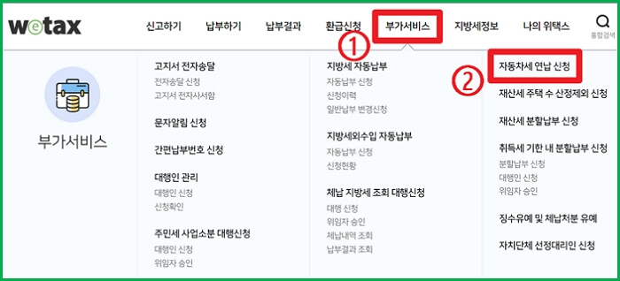 2. ① 부가서비스에서 ② 자동차세 연납 신청 클릭 → 연납신고서 작성 후 자동차세 납부