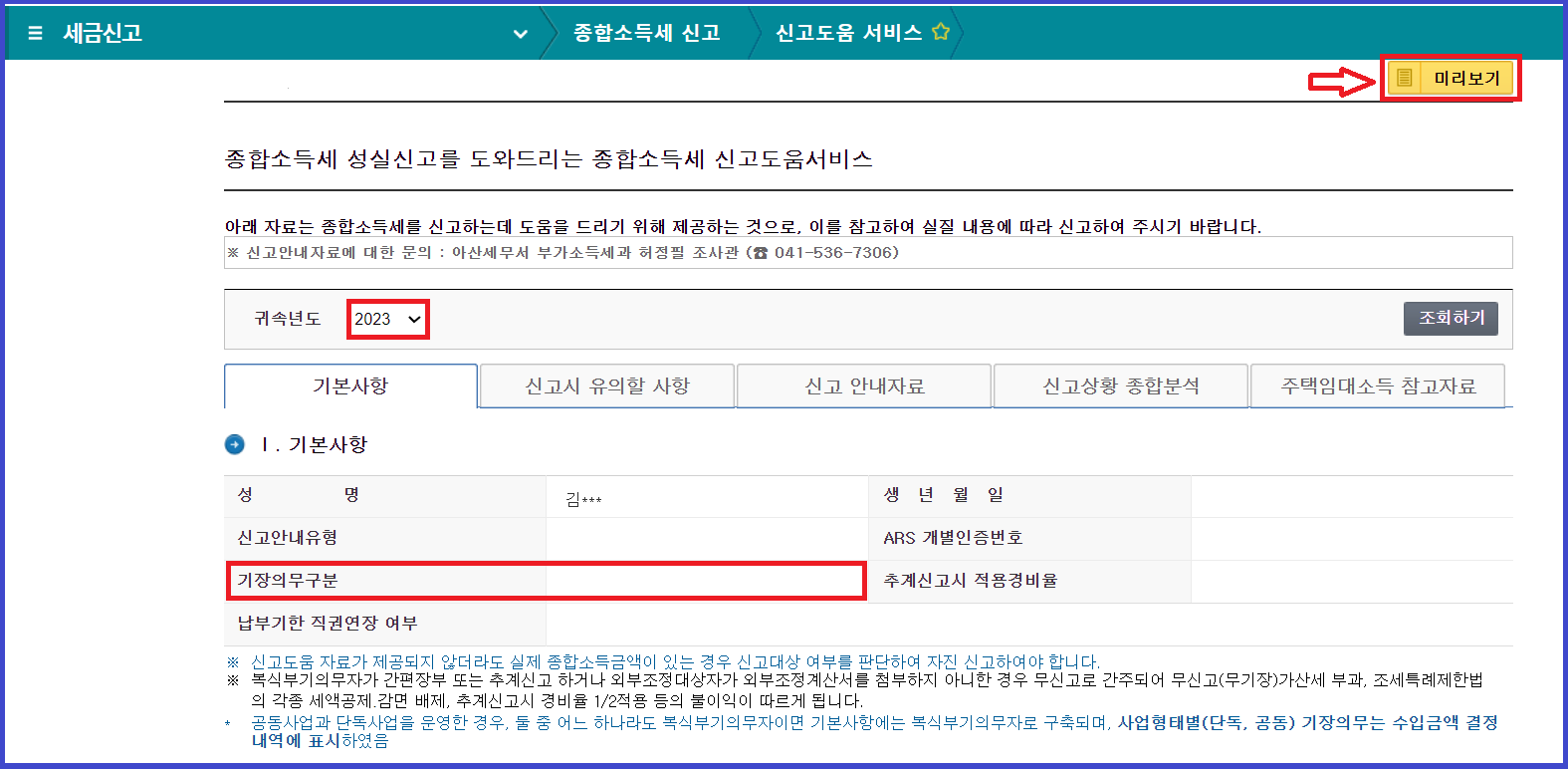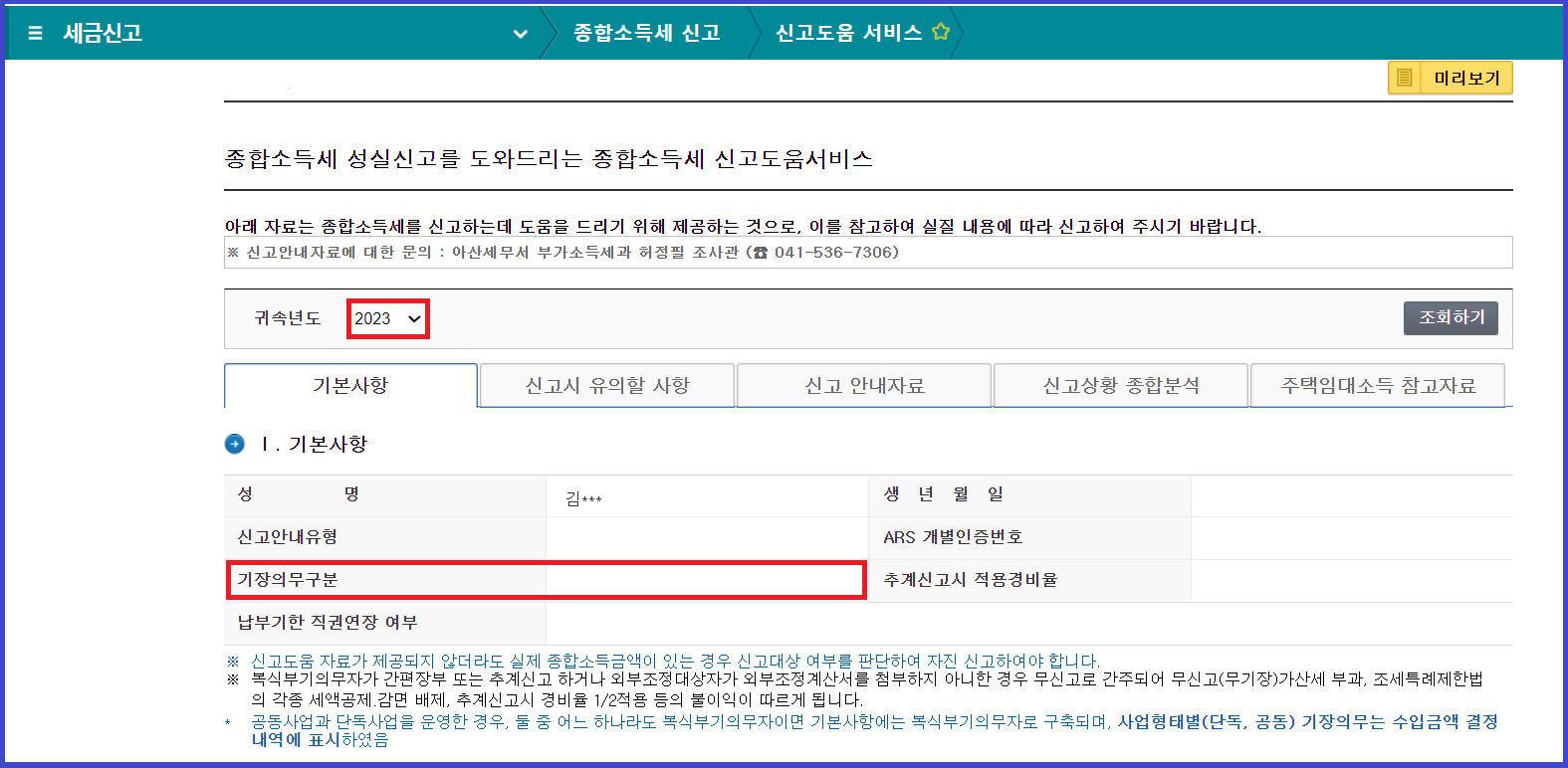 4. 기본사항에서 [신고안내유형] [기장의무구분]을 확인하여 종합소득세 신고 대상 유무를 확인하실 수 있습니다. 종합소득세 신고 대상에 해당하는 경우 [종합소득세 신고안내자료]를 통해 자세한 내용을 확인하실 수 있습니다.