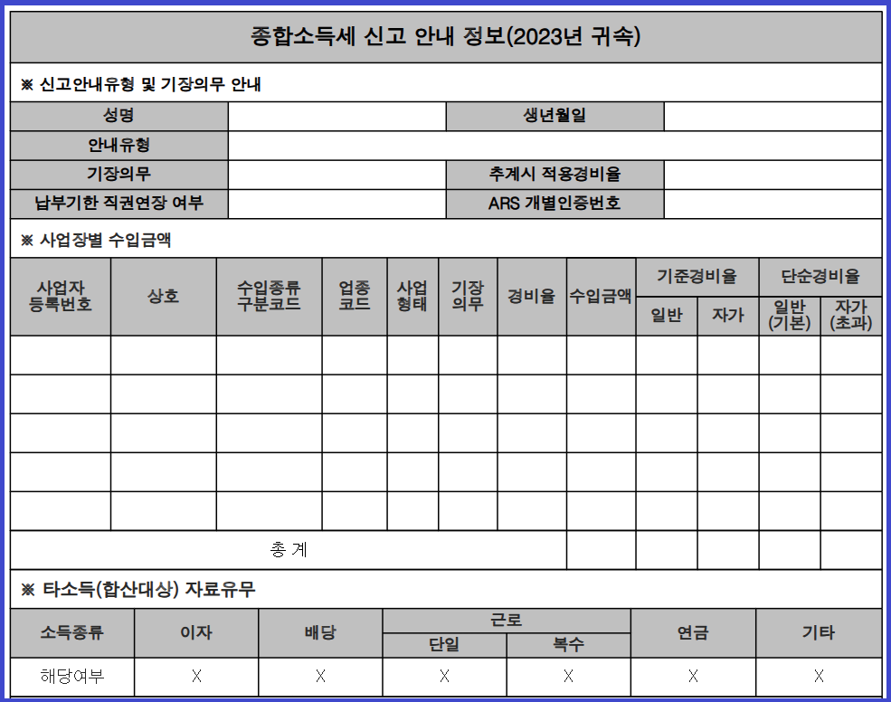 종합소득세 신고안내유형 정보가 없다면 종합소득세 신고 대상자가 아니거나, 국세청에 확인된 소득이 없는 경우일 수 있습니다.
