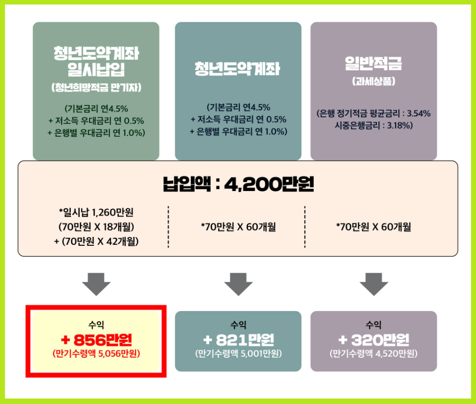 ✅ 일시납입금액이 1,260만원이고, 총 70만원씩 42개월을 납부했을 경우 약 856만원의 금리 혜택을 받을 수 있으며, 만기에 5,056만원을 받을 수 있습니다.